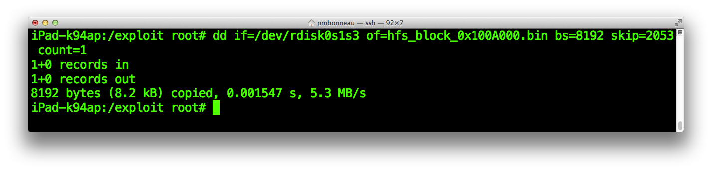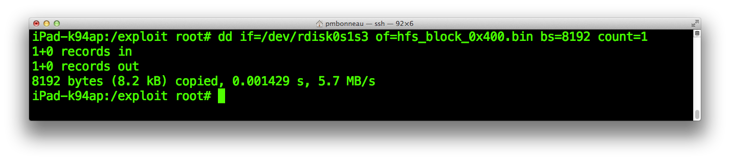 iPad-k94ap#dd if=/dev/rdisk0s1s3 of=hfs_block_0x100A000.bin bs=8192 skip=2053 count=1