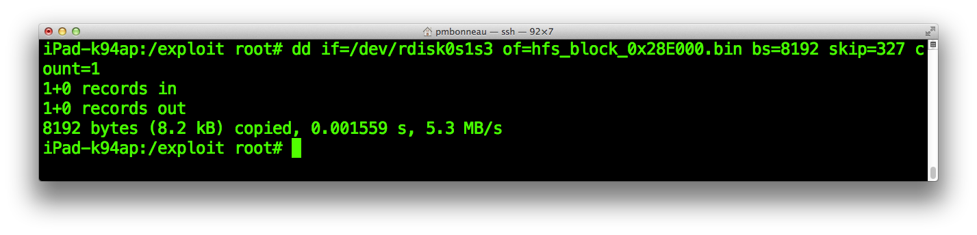 iPad-k94ap#dd if=/dev/rdisk0s1s3 of=hfs_block_0x28E000.bin bs=8192 skip=327 count=1