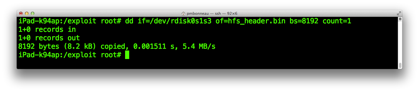 iPad-k94ap#dd if=/dev/rdisk0s1s3 of=hfs_header.bin bs=8192 count=1