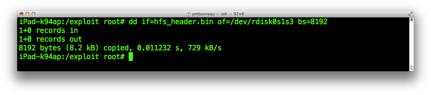 iPad-k94ap#dd if=hfs_header.bin of=/dev/rdisk0s1s3 bs=8192