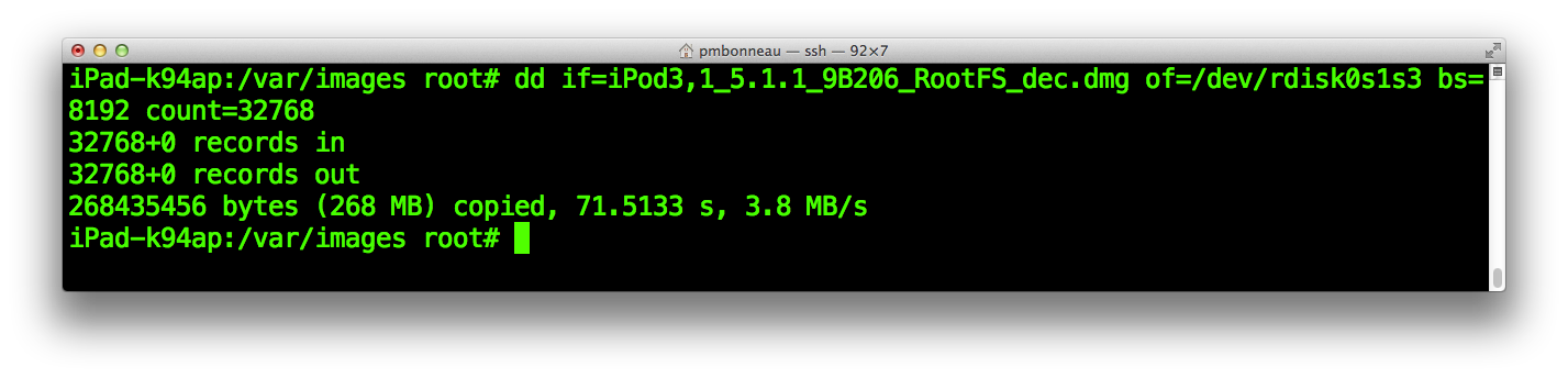 iPad-k94ap#dd if=iPod3,1_5.1.1_9B206_RootFS_dec.dmg of=/dev/rdisk0s1s3 bs=8192 count=32768