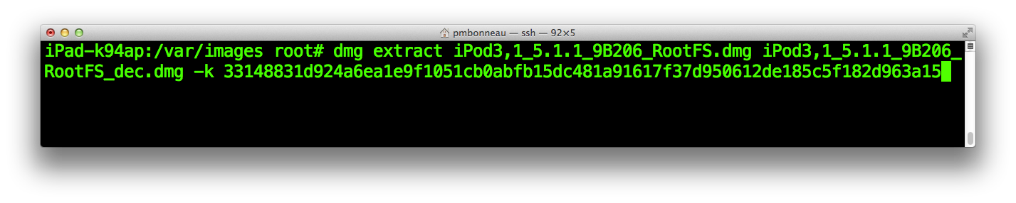 iPad-k94ap#dmg extract iPod3,1_5.1.1_9B206_RootFS.dmg iPod3,1_5.1.1_9B206_RootFS_dec.dmg -k 33148831d924a6ea1e9f1051cb0abfb15dc481a91617f37d950612de185c5f182d963a15