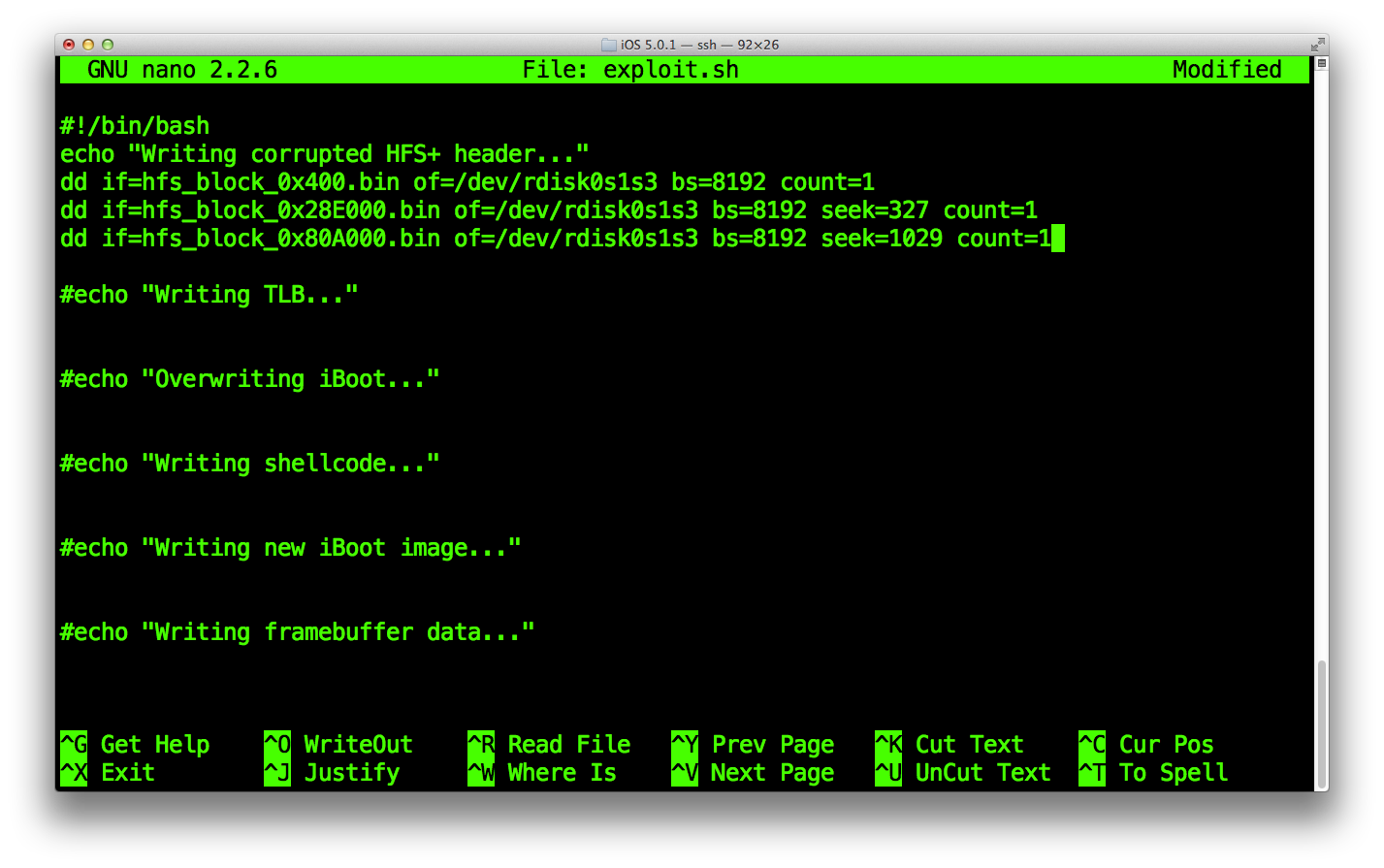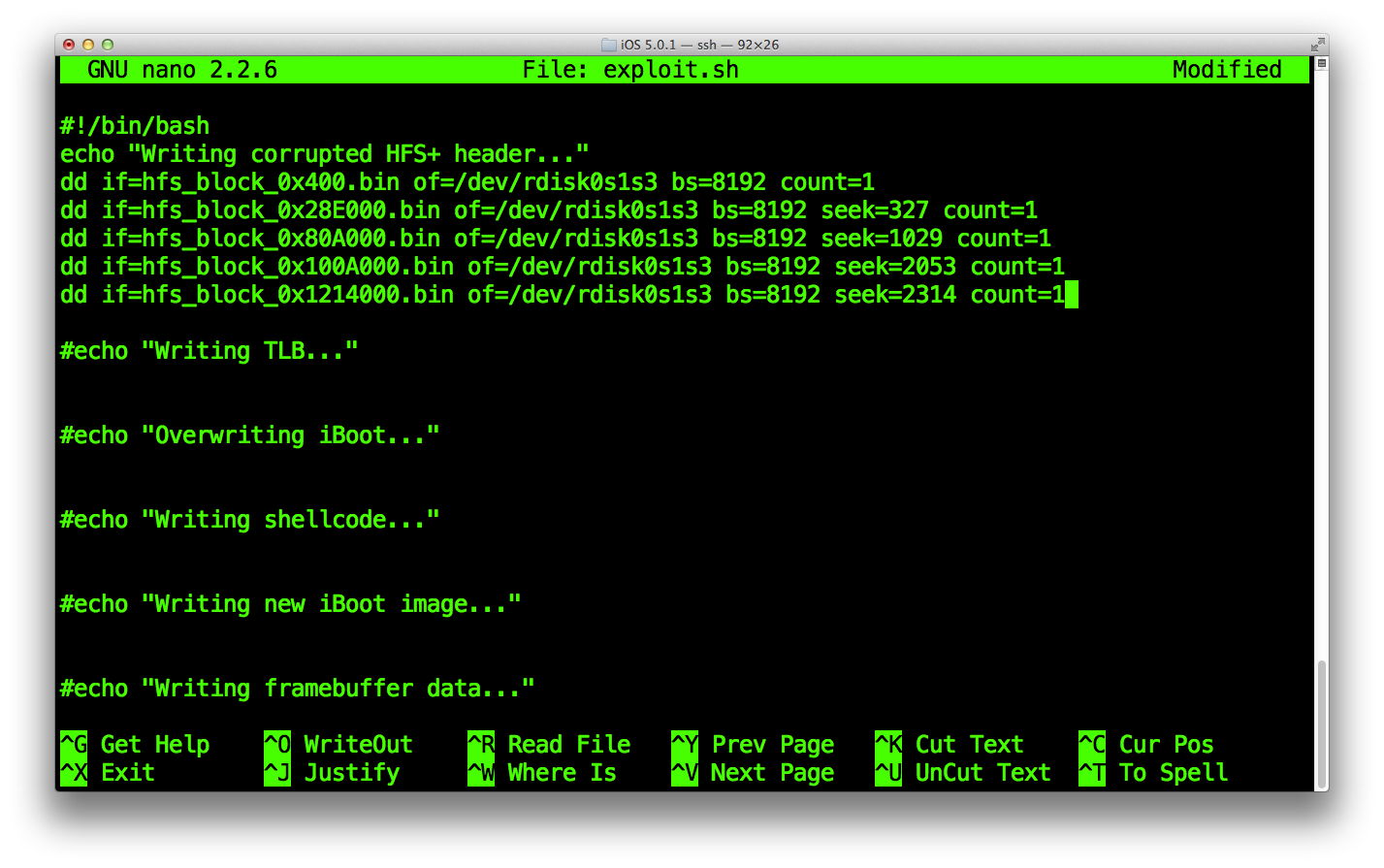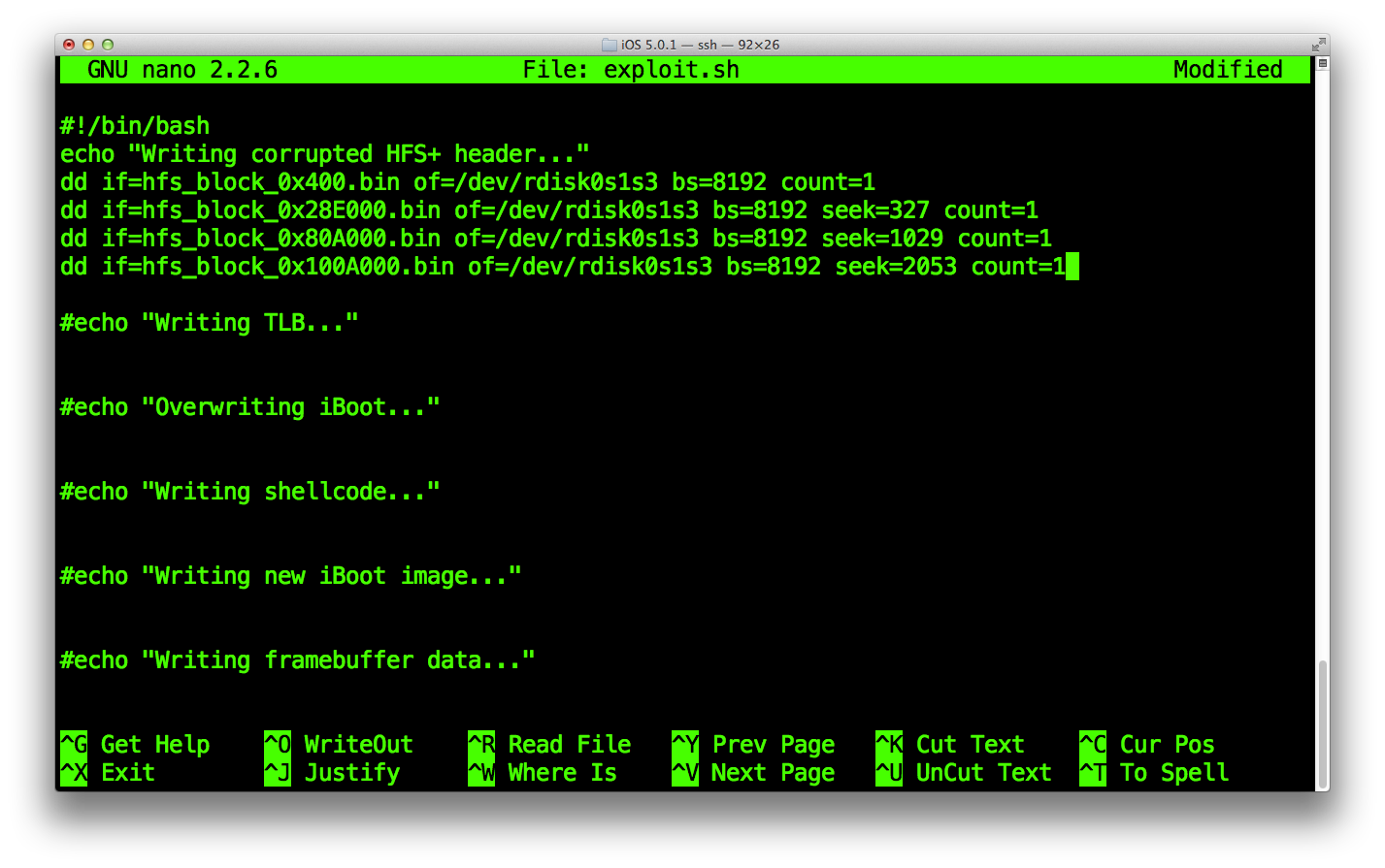 We want to write back those five blocks we dumped at their original position, so iBoot's HFS+ driver can parse a valid HFS+ filesystem. To make things easier when writing blocks back to their original position, let's build a small shell script called exploit.sh. This script will contains all dd commands we must run in order to write any blocks we want into the "Exploit" partition. Eventually, we will write some blocks containing our exploit implementation, such as TLB, iBoot images and shellcode.