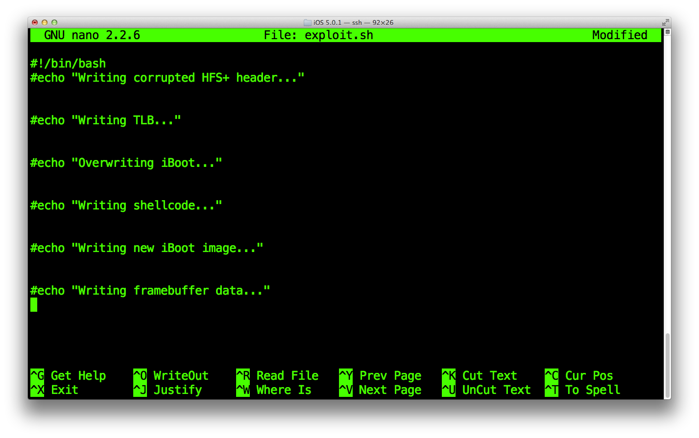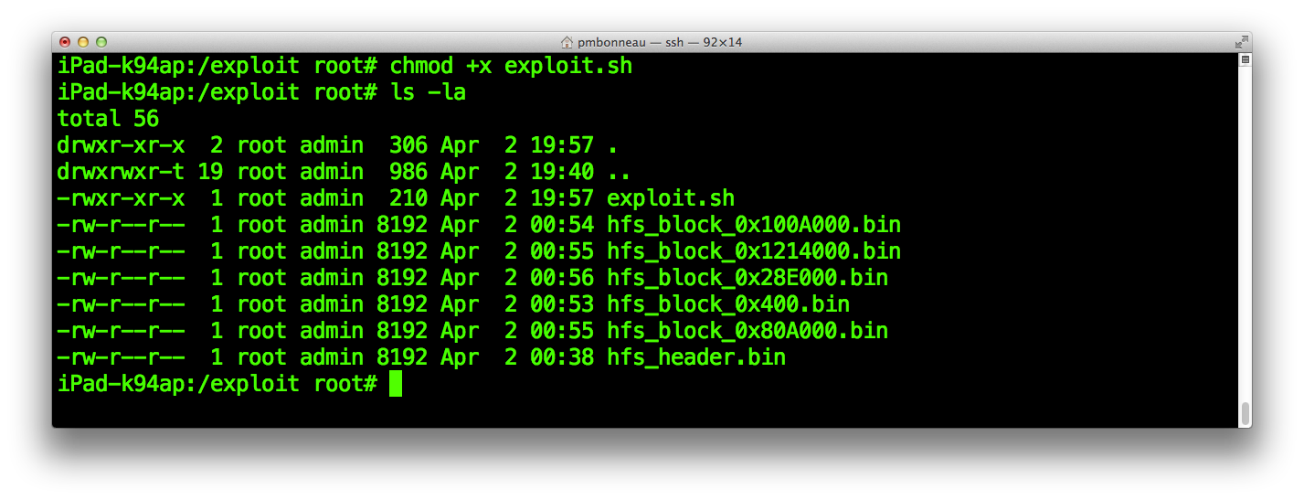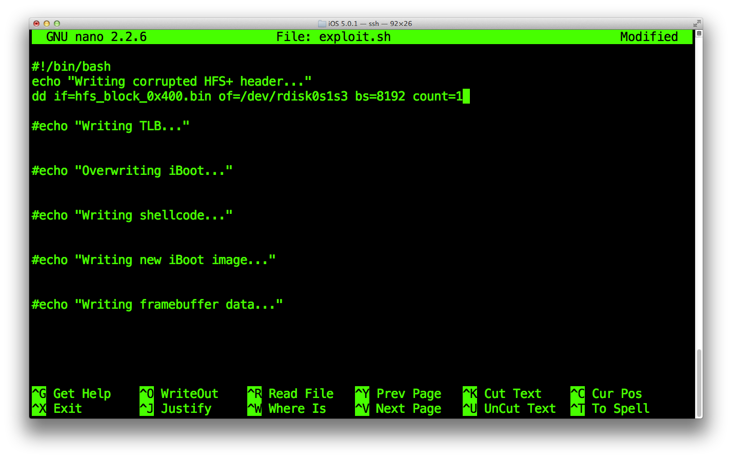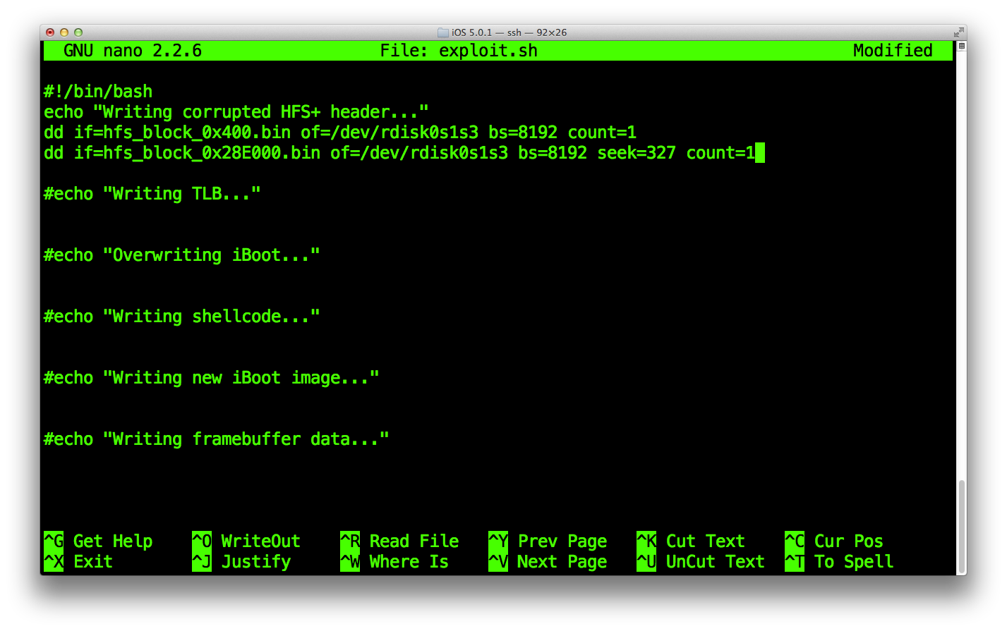 We want to write back those five blocks we dumped at their original position, so iBoot's HFS+ driver can parse a valid HFS+ filesystem. To make things easier when writing blocks back to their original position, let's build a small shell script called exploit.sh. This script will contains all dd commands we must run in order to write any blocks we want into the "Exploit" partition. Eventually, we will write some blocks containing our exploit implementation, such as TLB, iBoot images and shellcode.