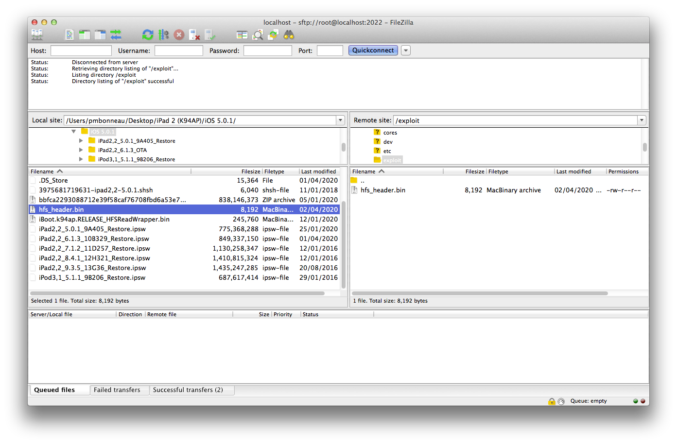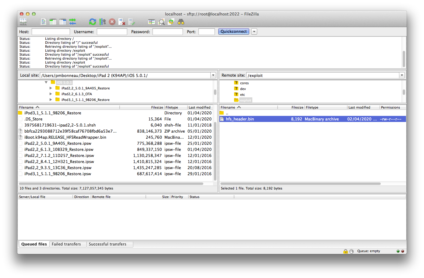 Download the dumped HFS+ header to your iOS 5.0.1 folder on your local computer. You can do this using command line scp or a GUI software (I usually use FileZilla on Mac).