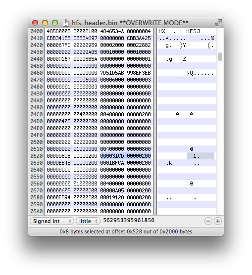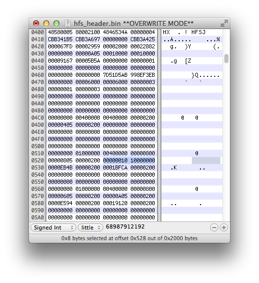 The following website contains a very good structure analysis of the HFS+ volume header, let's compare our dump with the info provided there to find what we have to corrupt in order to trigger the bug.In our dump, the HFS+ volume header starts at 0x400. It starts with the H signature, so this is offset 0x0 in the "Offsets in the HFS+ volume header" table found on the website.