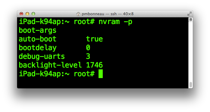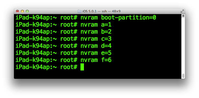 I recommand delete all event-related variables such as "obliteration", "panic" and similar ones if there are any using nvram -d [variable]. The best is to keep only the least possible like I did for the screenshot above in order to avoid later nvram changes. Once this is done, add boot-partition variable in nvram and set its value to 0. This will makes iBoot set its boot partition index as 0, which is same value as its default hardcoded boot-partition variable. This won't change anything because 0 is the default index iBoot uses for the main OS partition. We do this because eventually we will set this value to 2 in order to boot our Exploit partition.