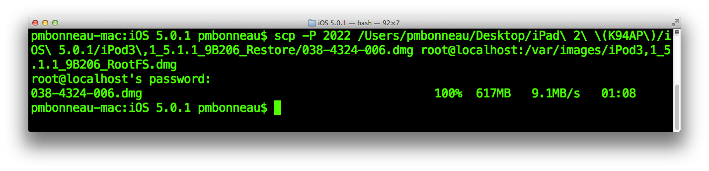 pmbonneau-mac#scp -P 2022 038-4324-006.dmg root@localhost:/var/images/iPod3,1_5.1.1_9B206_RootFS.dmg